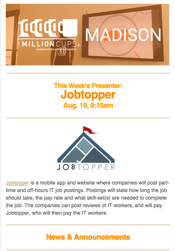 I was a volunteer founder and organizer for the Madison chapter of the entrepreneurs’ meetup 1 Million Cups. From 2014-2016, I wrote a weekly newsletter that included announcements, promotion of a local startup company, a spotlight feature of a noteworthy audience member, and spotlights on financial sponsors. I used a tone that matched the spirit of the entrepreneurial community: friendly, familiar, and a touch irreverent, while still informative.