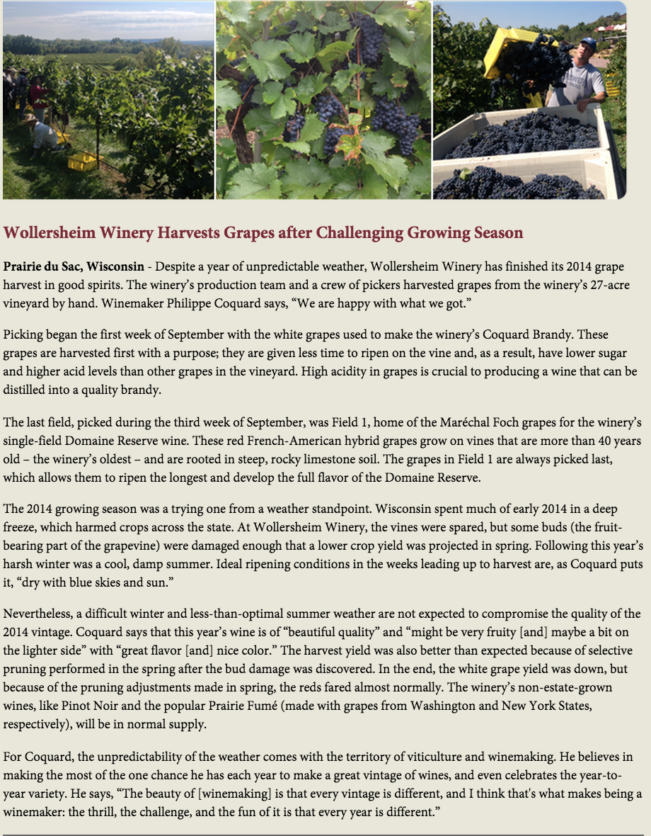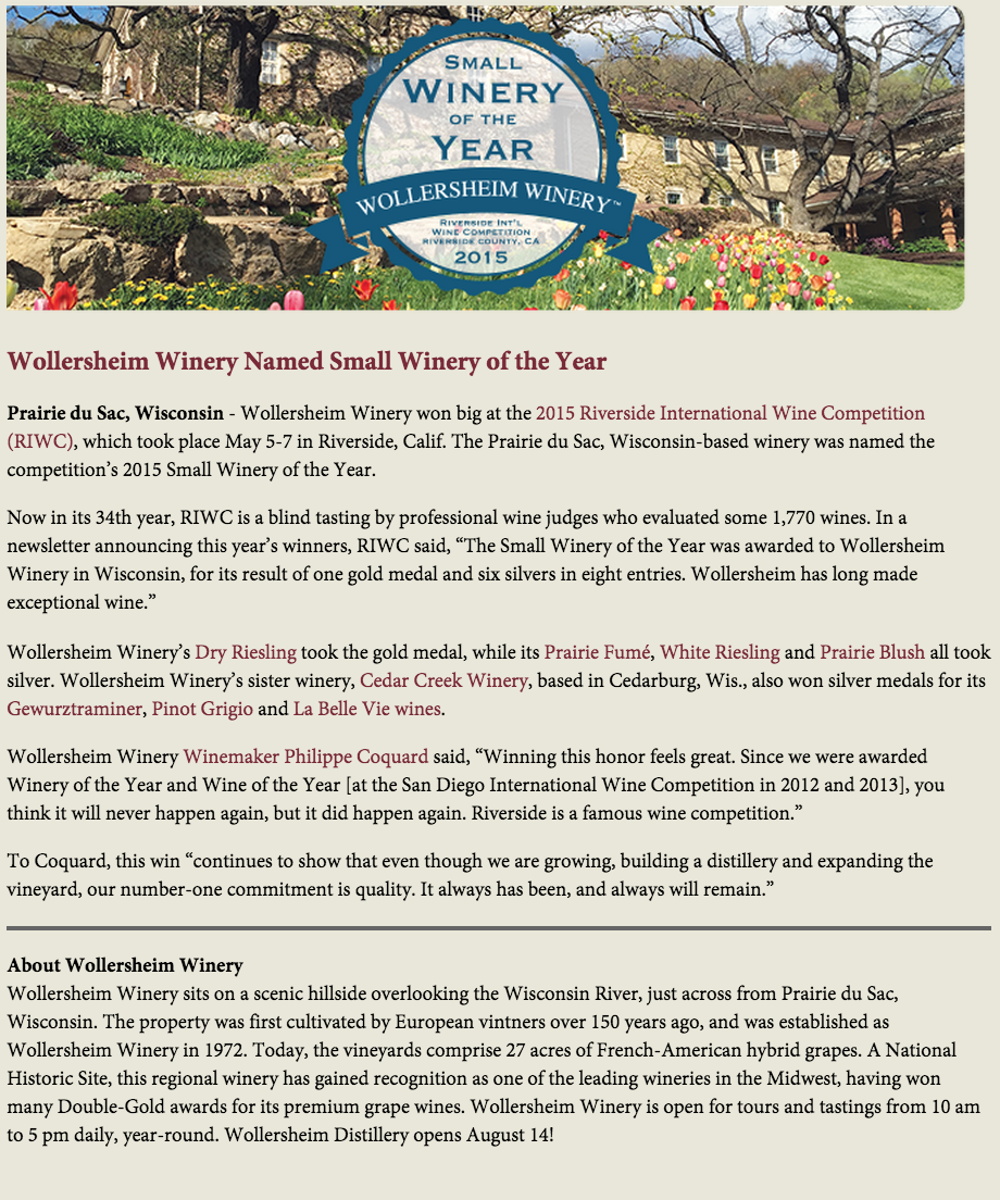 At Wollersheim Winery & Distillery, I issued press releases to announce new products, major accolades, the annual grape harvest, and public events.